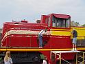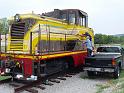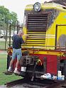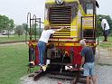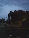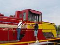 Mark Ledbetter and Maryann Knowles start masking and painting the red. Masking is extremely tedious, but the painting goes quickly with the help of another Cowan resident. A crowd gathers as we begin removing the tape to reveal the final paint job. Removing the masking tape is almost as tedious as putting it on correctly, and the work continues until after sunset. What fun painting the handrails after dark! |