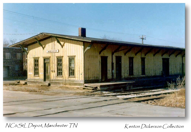 I saw my first train at Manchester, as a small child in my mother's arms. It was a passenger train, and I can still see the smoke belching out of the stack and the bell clangin. Passenger trains were discontinued on that branch about 1930. The branch continued on into CSX operation, but CSX forewent operation of it in the mid 1980s. It is now the Caney Fork and Western, with headquarters at McMinnville."