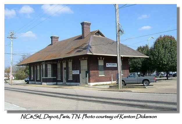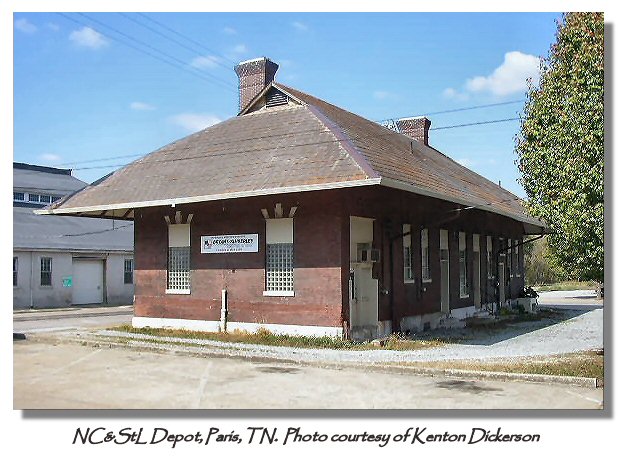 The NC&Stl line that ran through Paris, TN was part of the Paducah and Memphis (P&M) Division originally laid down by the Paducah, Tennessee, and Alabama (PT&A) RR. PT&A began building the line in 1890 from Paducah south toward west TN. A short time later the line reached Paris and continued south to Bruceton, Lexington, Jackson, and Memphis. PT&A went bankrupt in 1896 and was purchased by L&N at auction and then leased to the NC&Stl. The NC&Stl depot was built in 1896 and was closed to passenger service in 1951.
