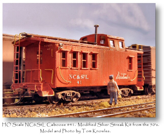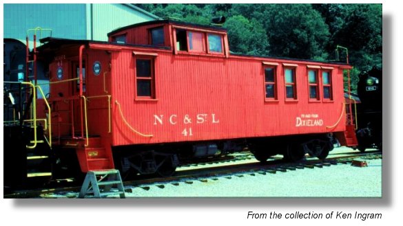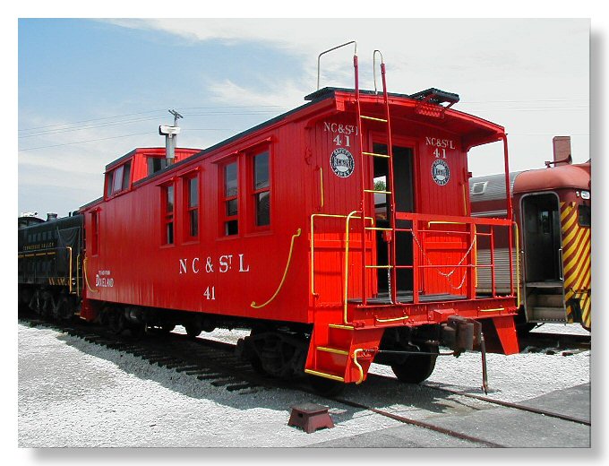 NC&StL Caboose #41, class NE-3.  Built 1924 Mt. Vernon Car for FEC; Acquired by NC&StL and rebuilt West Nashville Shops 1935-36.  Modified at some point to add extra seats for branchline passenger service. Steel frame, drovers style, wood sheathed, offset cupola.