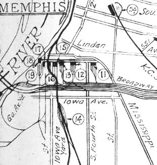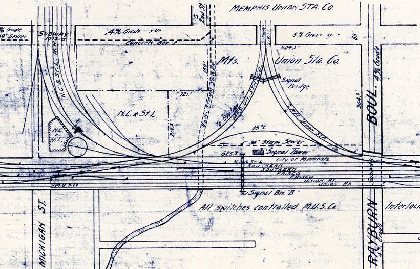 Memphis Union Station Company trackage map between Broadway to Calhoun