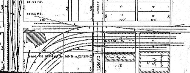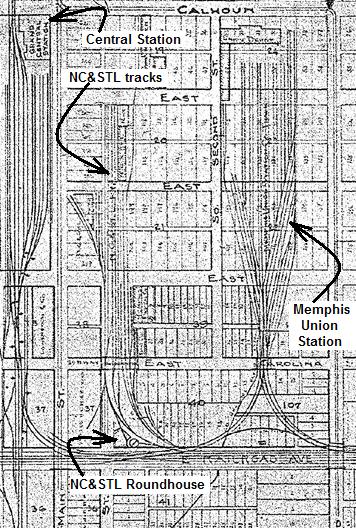 Early 1900's NC&STL Railway line on Frisco Map of Broadway between Memphis Union Station and west of KC Junction. NC&STL Rwy. is the northmost line of seven tracks.