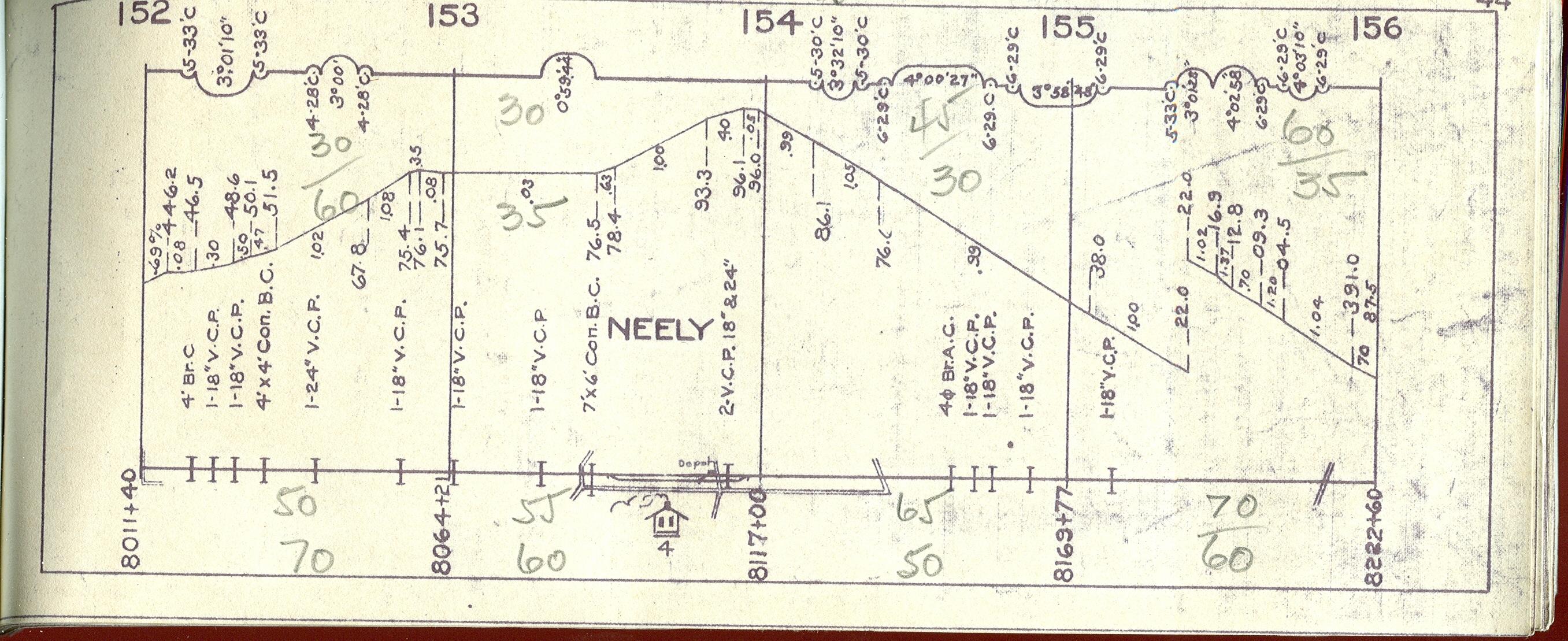Neely Station Cutoff Road looking northeast (milepost 155.0). This location has been realigned from the early main line.