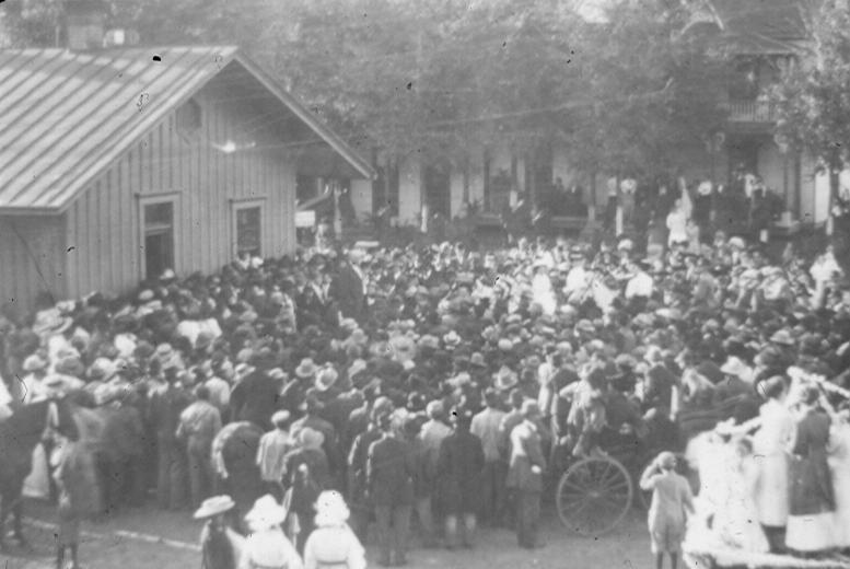 Crowd people listen a special speaker (name unknown) at the Whiteville Depot in the early 1900's.