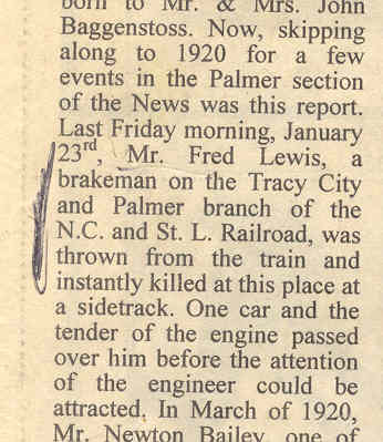 On Friday the 23rd of January 1920, Mr. Fred Lewis, a brakeman on the Tracy City and Palmer branch of the NC&StL Railroad, was thrown from the train and instantly killed at a sidetrack in Palmer. One car and the tender of the engine passed over him before the attention of the engineer could be attracted.